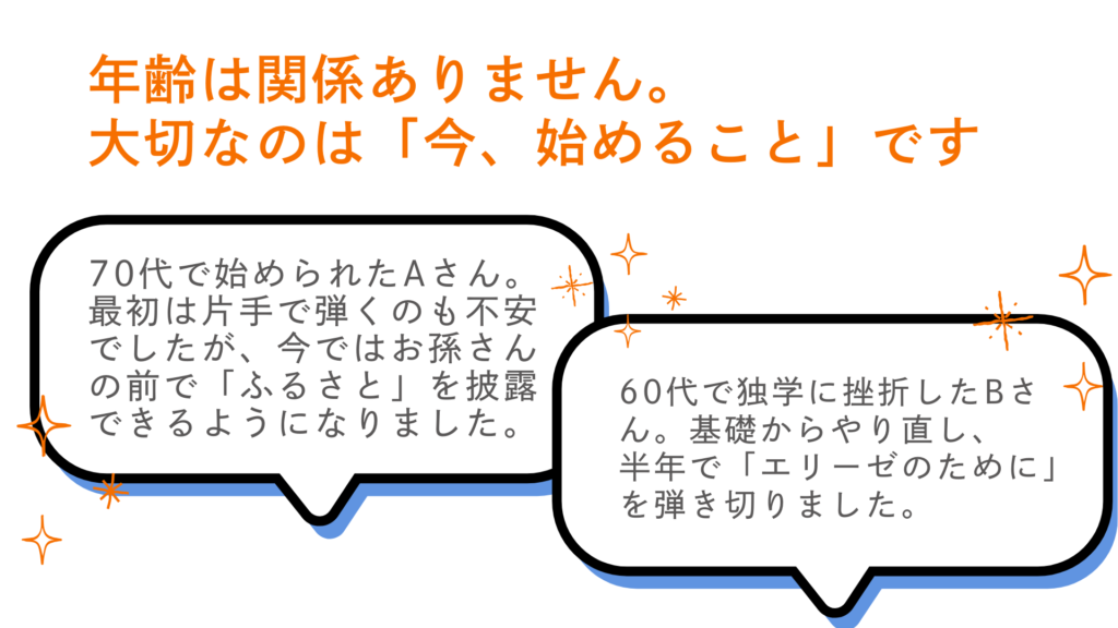 年齢や経験に関係なく、ピアノは生活を豊かにしてくれる素敵な趣味なんですよ。
